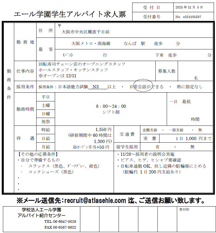 2025年12月11日にオープンする回転寿司チェーン店のオープニングスタッフで、ホール・キッチンのスタッフを募集しています。オープン前にスタッフを募集・登録して、面接合格者は11月28日から説明会が行われます。友達同士での応募も可能です。