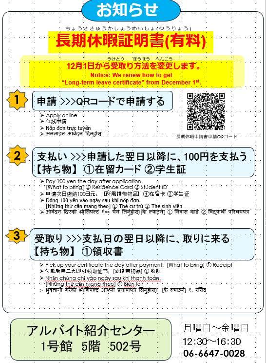 12月1日(月)より長期休暇証明書(有料)の受取り方法が変更になります。