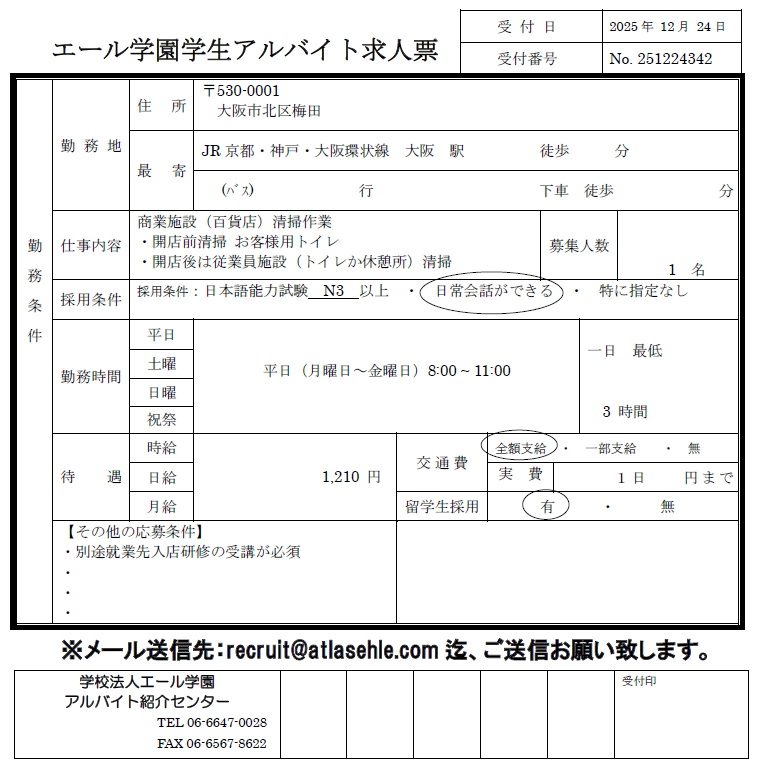 2025年12月24日 【アルバイト】商業施設での清掃業務 o251224342 商業施設(百貨店)での午前中の清掃作業です。 お問い合わせは、 アルバイト紹介センター 1号館 5階 502号 12:30~16:00 TEL:06-6647-0028 WEBで予約をしてから、必ず下記を持って来てください。 ・学生証・在留カード blog